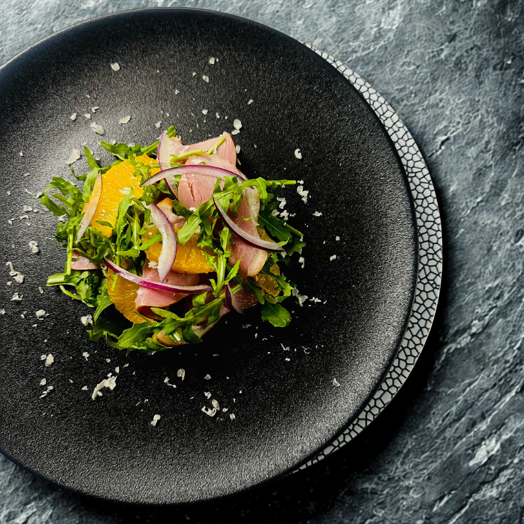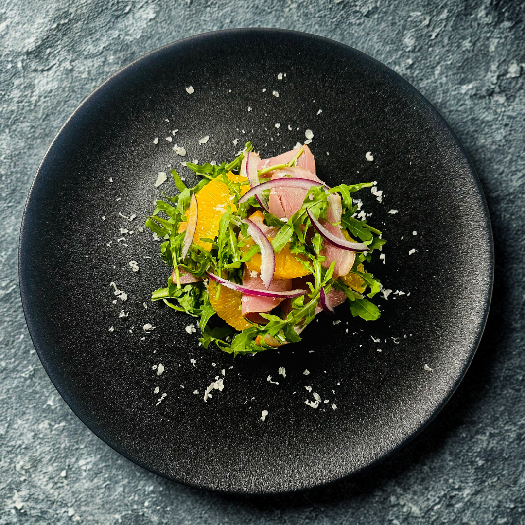 Main Ingredients: Smoked Duck Breast, Orange, Cherry Tomato, Parmesan Cheese, Arugula, Age Balsamic Dressing
