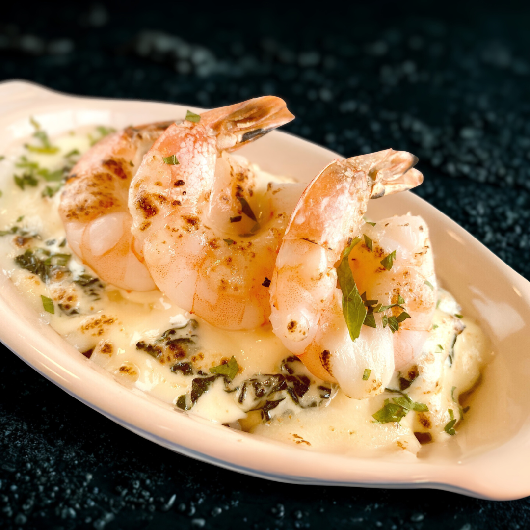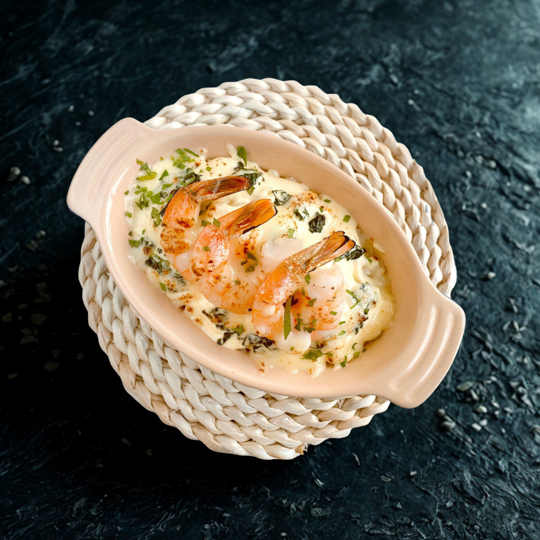 Main Ingredients: Prawn, Spinach, Homemade Cream Sauce, Mozzarella, Cheddar and Fried Rice / Penne