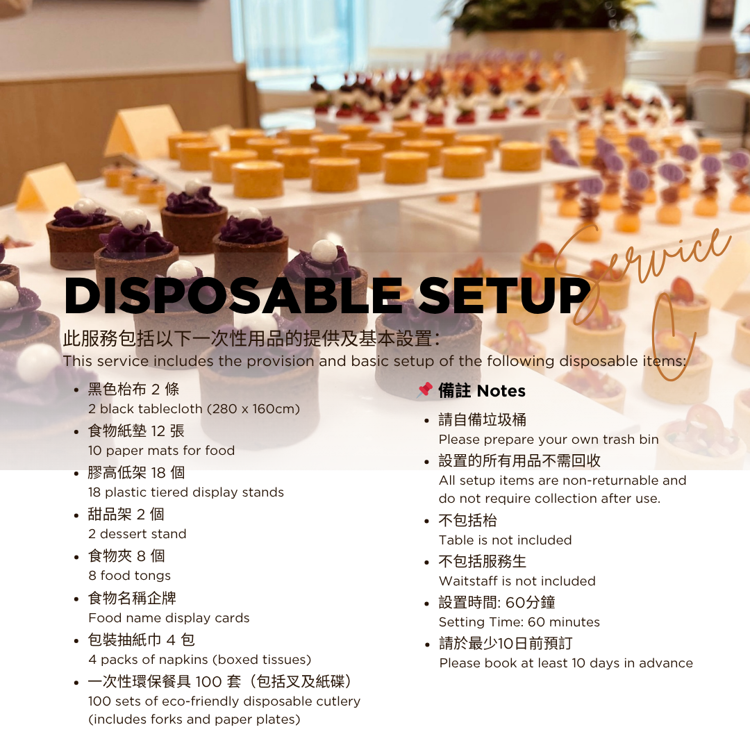 2. 一次性用品設置:由 147catering 獨家設計,時尚簡約、價格實惠,輕鬆完成場地佈置。