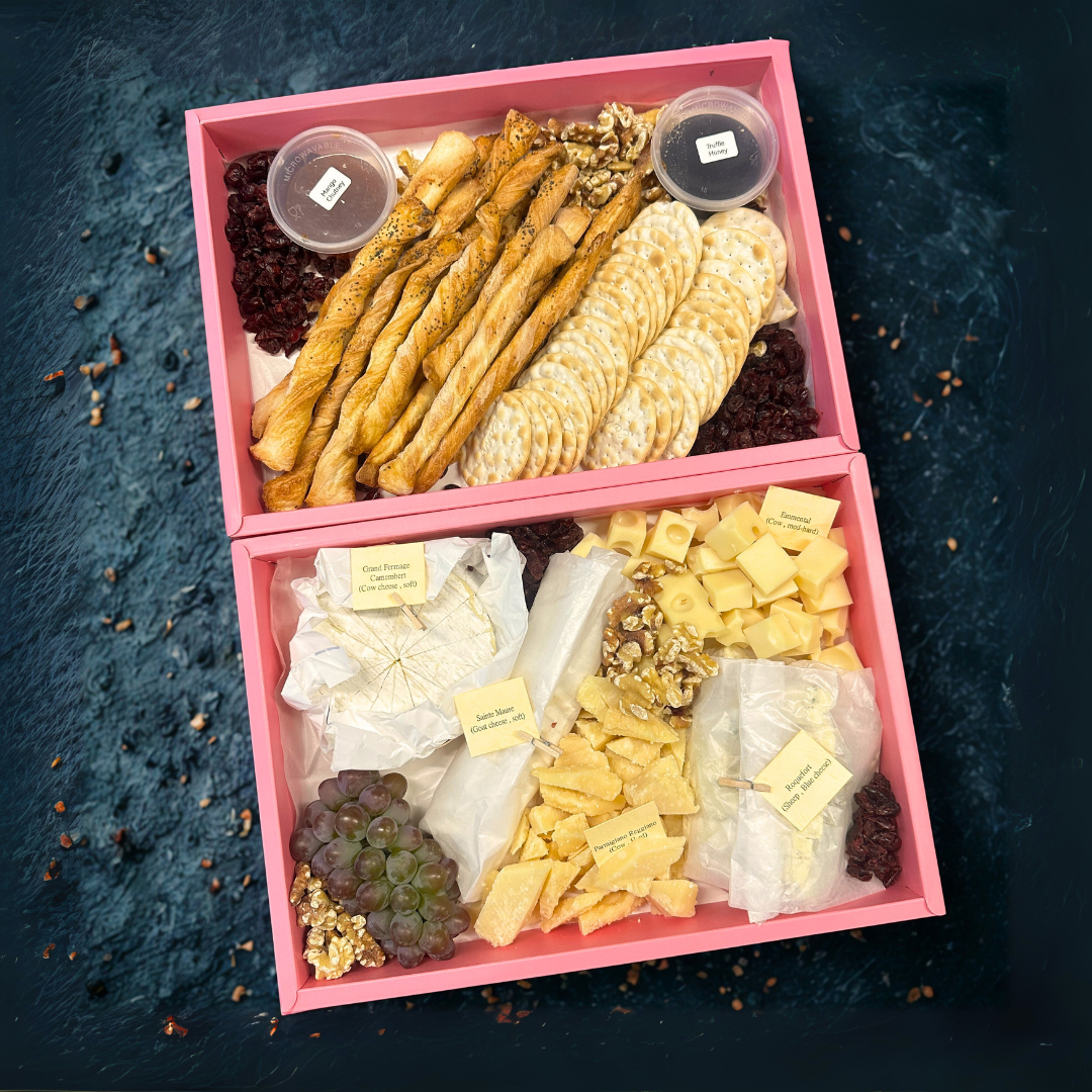 主要成分:帕瑪森乾酪(牛,硬質)Grand Fermage 卡門貝乾酪(牛奶酪,軟質)埃曼塔爾乾酪(牛,中硬質)洛克福乾酪(羊,藍紋奶酪)聖摩爾乾酪(山羊奶酪,軟質)卡爾餅乾、葡萄和堅果。