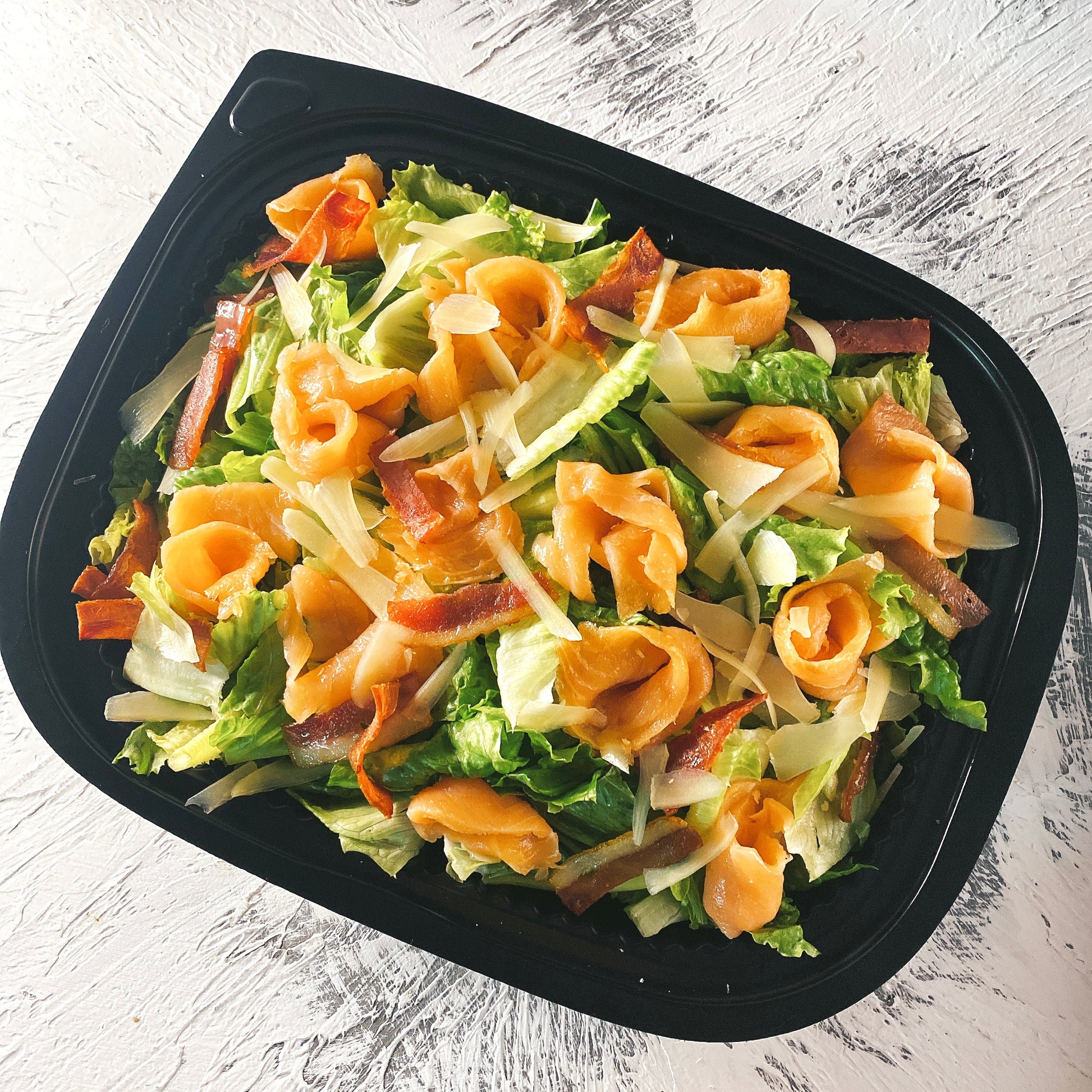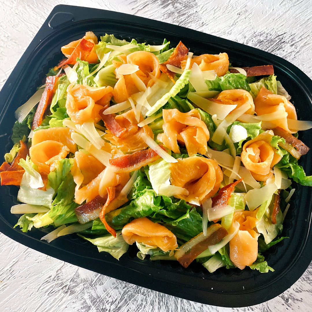 主要成分:蘇格蘭煙三文魚、羅馬生菜、麵包粒、 煙肉、 巴馬臣芝士、凱薩沙律醬