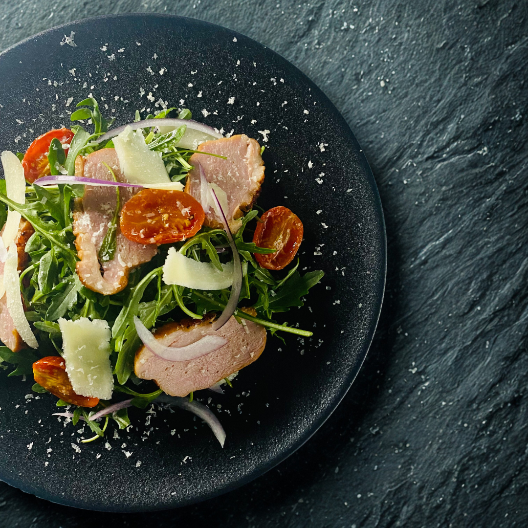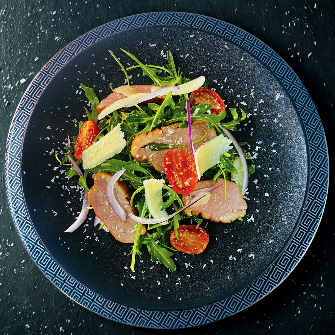 主要成分:煙燻鴨胸肉,芝麻菜,半乾車厘茄、紅洋蔥、巴馬臣芝士和 陳年意大利黑醋